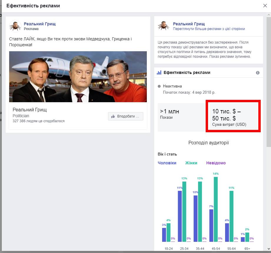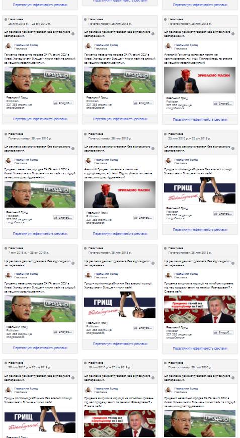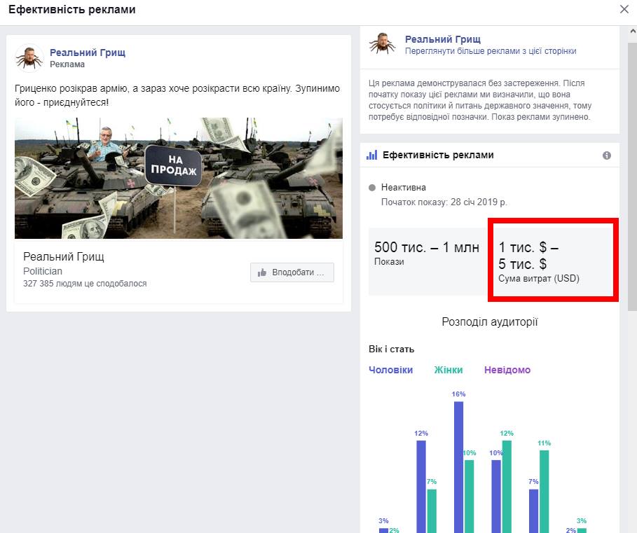 Фейсбук розкрив вартість пропаганди проти Гриценка на замовному акаунті "Реальний Грищ"