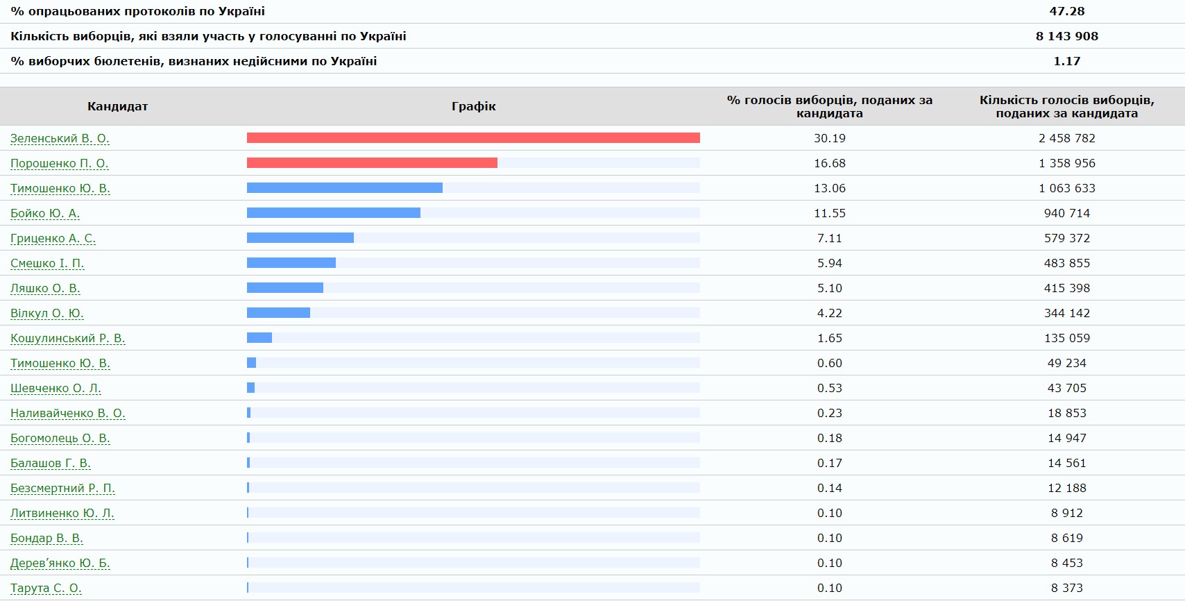 На 8:15 1 квітня оброблено 47,28% протоколів. Підраховано голоси 8 143 908 виборців. На першому місці Володимир Зеленський – 30,19%, на другому Петро Порошенко – 16,68% і на третьому Юлія Тимошенко – 13,06%. Далі йдуть Юрій Бойко – 11,55% голосів, Анатолій Гриценко – 7,11%, Ігор Смешко – 5,94% та Олег Ляшко – 5,10%. Водночас 1,17% бюлетенів були визнані недійсними.