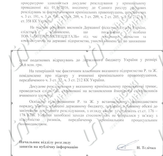 "Оскільки підозрюваними Р. і Ж. у встановленому законом порядку збитки, завдані державному бюджету, погашені в повному обсязі до кінця досудового розслідування... запобіжні заходи щодо них не обиралися у зв'язку з відсутністю ризиків, передбачених кримінальним процесуальним законодавством", - йдеться в ньому.
