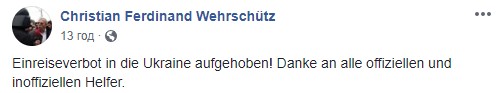 "Заборона на в'їзд в Україну знята! Спасибі всім офіційним і неофіційним помічникам", - зазначив він.