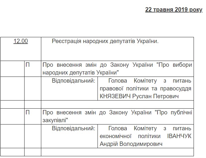 Варто зазначити, що згідно з порядком денним, опублікованим на сайті Верховної Ради, парламентарії розглянуть два законопроекти: про внесення змін до закону про вибори народних депутатів і про внесення змін до закону про державні закупівлі, однак номери документів відсутні.