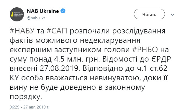 Про це йдеться в твіттері НАБУ, передає Цензор.НЕТ.