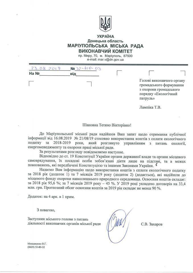 "Аналізуючи використання екологічного податку Маріупольською міською радою, робимо висновок, що кошти витрачаються не на покращення екологічної ситуації в місті, а для вирішення поточних проблем комунальних підприємств міста, безсистемного підходу до озеленення міста та інші заходи, які не є нагальними для одного із найбільш забруднених міст держави, вирішення особистих інтересів чиновників на виконанні "робіт", - підсумували в "Екопатрулі".