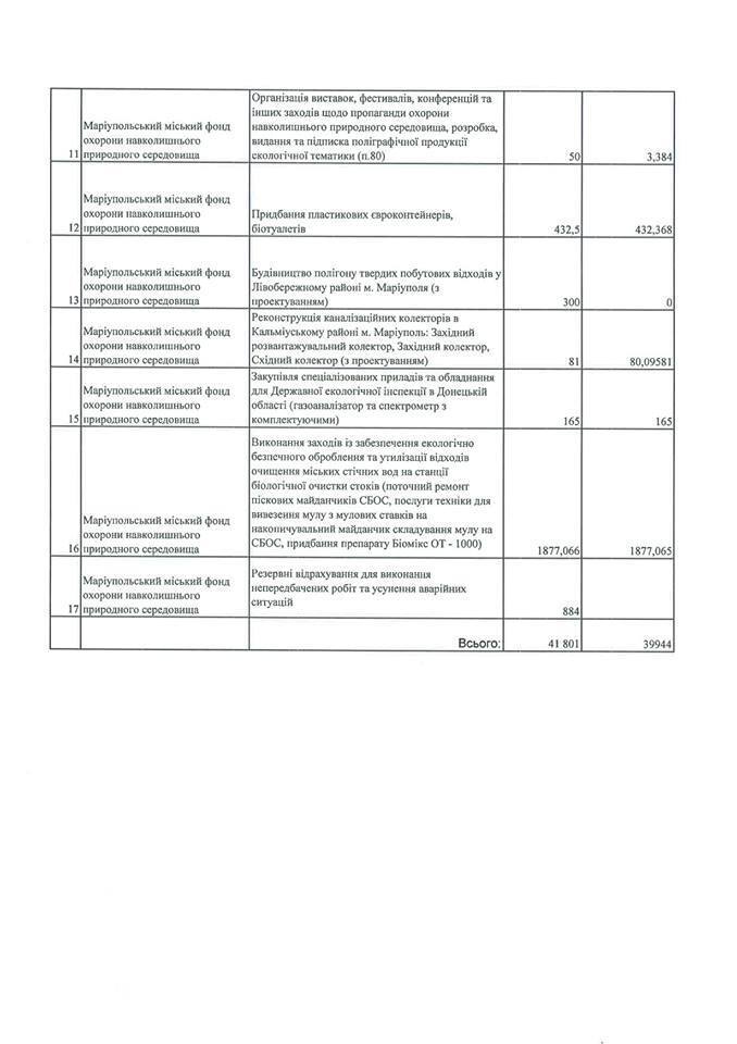 "Привертають увагу пункти з озеленення міста, на які заплановано було в 2018 році 2483 тис. грн та в 2019 році на загальну вартість майже 9 млн грн. При цьому відсутня детальна інформація про заплановані роботи, а саме - створення автоматичної системи поливу зелених насаджень, проведення інвентаризації зелених насаджень у м. Маріуполі, наукових досліджень з розвитку зеленого господарства міста, з огляду на глобальні кліматичні зміни", - зауважили екологи.