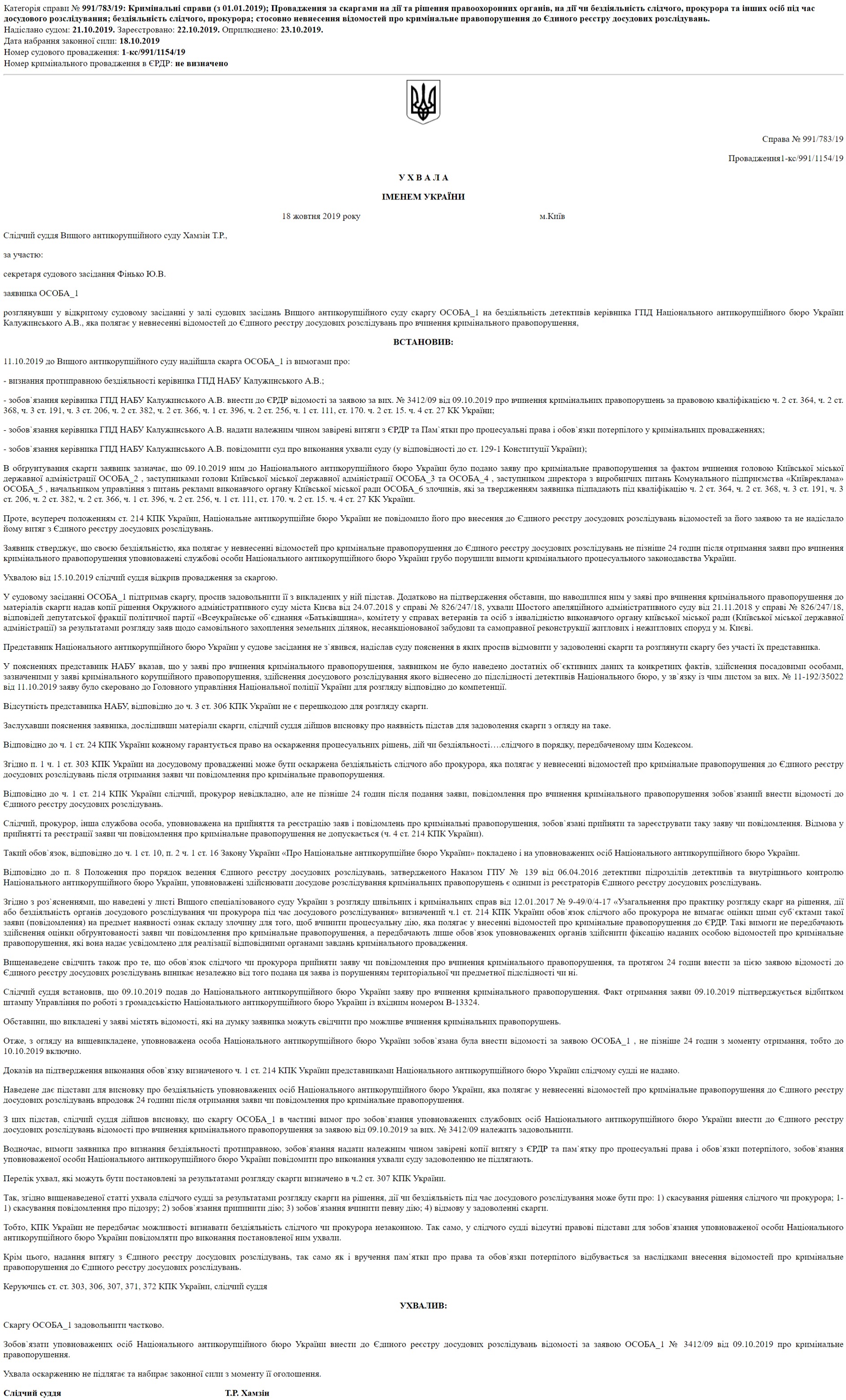 Як пише Цензор.НЕТ із посиланням на пресслужбу ВАКС, 18 жовтня суддя частково задовольнив скаргу про бездіяльність керівника головного підрозділу детективів НАБУ.