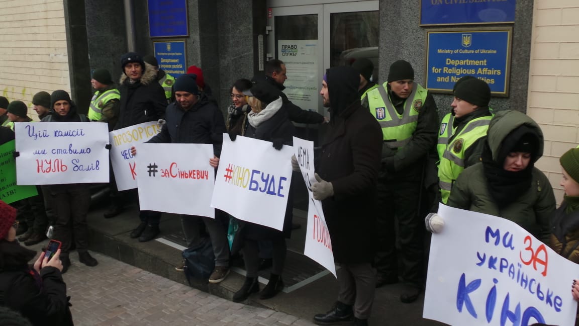 Кілька десятків діячів кіноіндустрії провели акцію протесту біля Нацагентства з питань державної служби на підтримку Юлії Сінькевич, яка брала участь у конкурсі на посаду глави Держагентства з питань кіно.