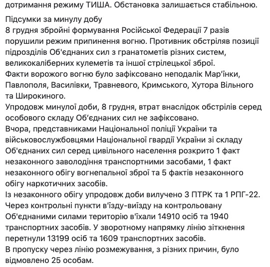 Напомним, в штабе операции Объединенных сил https://inforesist.org/goto/https:/www.facebook.com/pressjfo.news/ сообщают , что вчера, 8 декабря, оккупанты семь раз нарушили режим прекращения огня. Они обстреливали украинские позиции из различных систем, крупнокалиберных пулеметов и другого стрелкового оружия.
