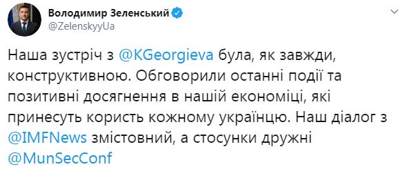 Президент України Володимир Зеленський в рамках Мюнхенської конференції провів зустріч з головою Міжнародного валютного фонду Крісталіною Георгієвою.