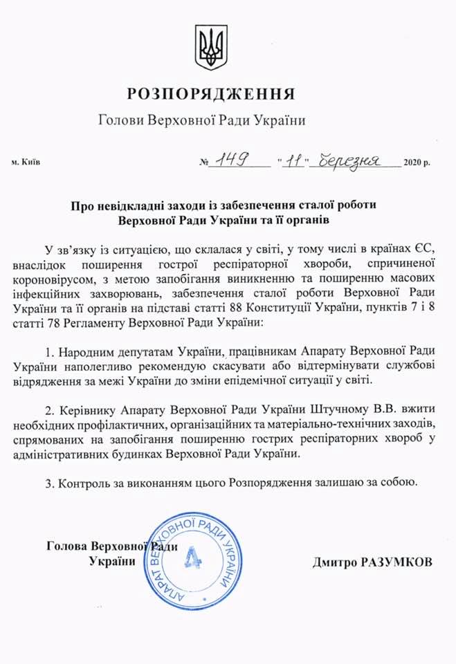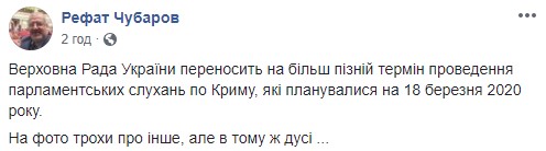 "Верховна Рада України переносить на більш пізній термін проведення парламентських слухань щодо Криму, які планувалися на 18 березня 2020 року", - написав Чубаров, і опублікував розпорядження ВРУ про забезпечення роботи Ради та її органів з урахуванням поширення коронавірусної інфекції у світі.