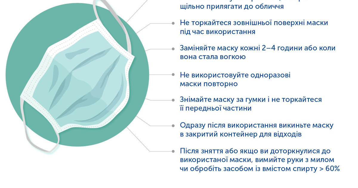 Не можна чіпати зовнішню частину маски руками. Якщо доторкнулися, помийте руки з милом чи обробіть спиртовмісним антисептиком.