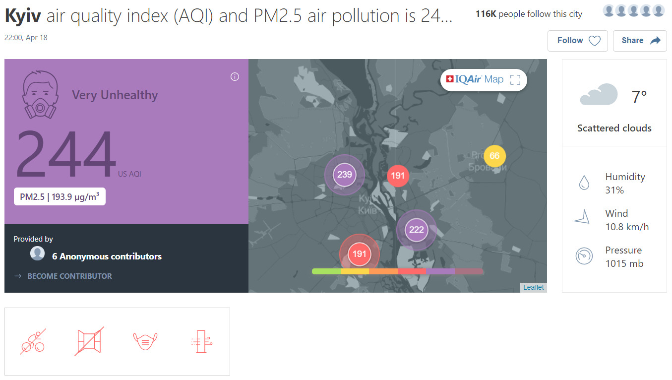 Станом на 22:53 18 квітня Київ посідає перше місце в переліку міст світу з найзабрудненішим повітрям.