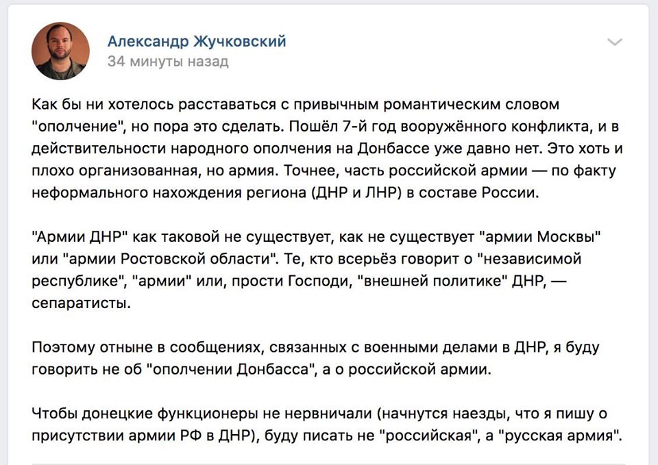 Він опублікував пост Жучковського, в якому той заявляє, що настав час попрощатися з "романтичним словом "ополчення" і почати називати речі своїми іменами.
