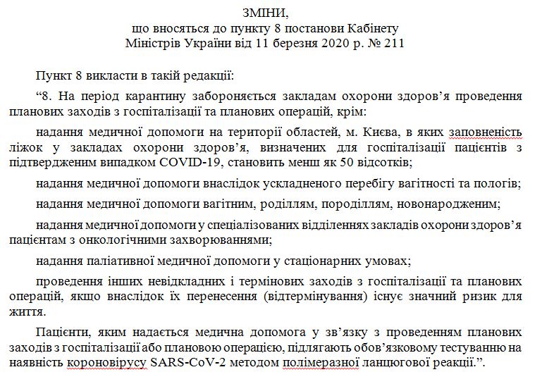 Підкреслюється, що пацієнти, яким надається медична допомога в зв'язку з проведенням планових заходів щодо госпіталізації або плановою операцією, підлягають обов'язковому тестуванню на наявність коронавірусу SARS-CoV-2 методом полімеразної ланцюгової реакції.