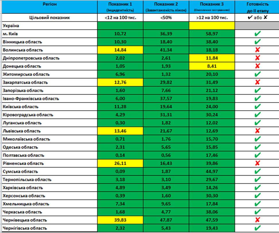 Згідно з даними МОЗ, поки не готові до послаблення карантину Волинська, Дніпропетровська, Донецька, Закарпатська, Львівська, Рівненська та Чернівецька області.