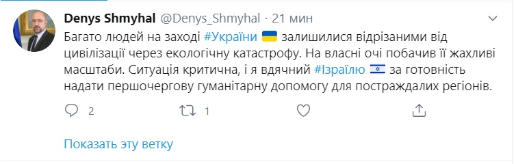 "Багато людей на заході України залишилися відрізаними від цивілізації через екологічну катастрофу. На власні очі побачив її жахливі масштаби. Ситуація критична, і я вдячний Ізраїлю за готовність надати першочергову гуманітарну допомогу для постраждалих регіонів", - написав Шмигаль.