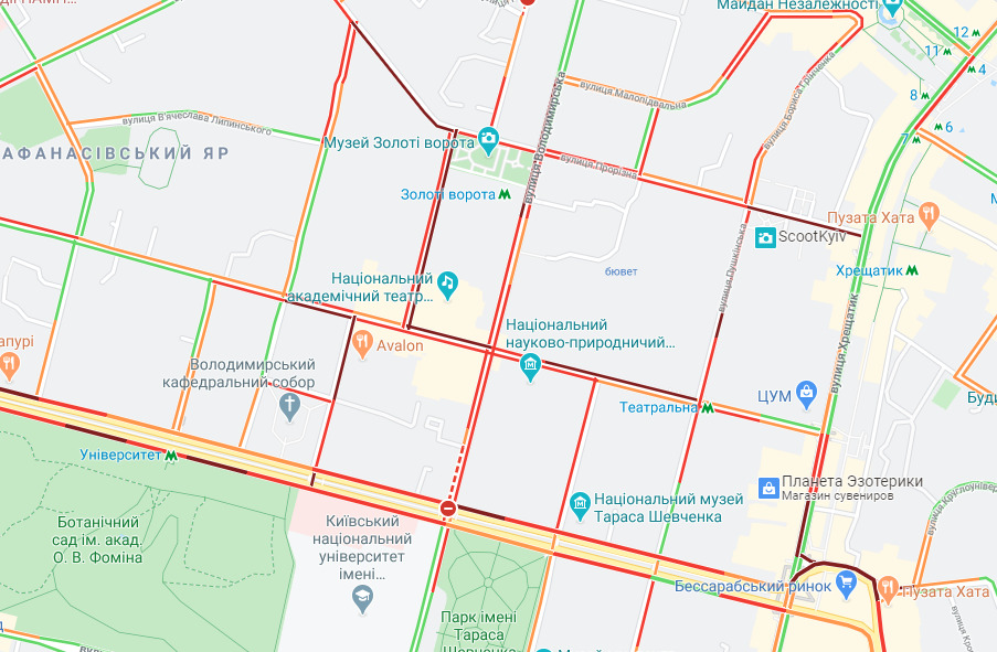 Через запроваджені обмеження утворилися пробки на вільній для проїзду частини Володимирської, вулицях Богдана Хмельницького, Леонтовича, Лисенка, Прорізній, частково - Хрещатику, бульварі Тараса Шевченка та інших.