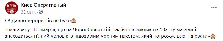 "З магазину "Велмарт" на вул. Чорнобильській, надійшов виклик на 102: "у магазині перебуває п'яний чоловік з підозрілим чорним пакетом, який погрожує всіх підірвати", - йдеться в повідомленні.