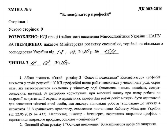 Міністерство розвитку економіки, торгівлі і сільського господарства України дозволило в кадрових документах вказувати професії у фемінітиві. Відповідні зміни прописано в наказі міністерства "Про затвердження Зміни №9 до національного класифікатора ДК 003: 2010" від 18 серпня, передає Цензор.НЕТ.