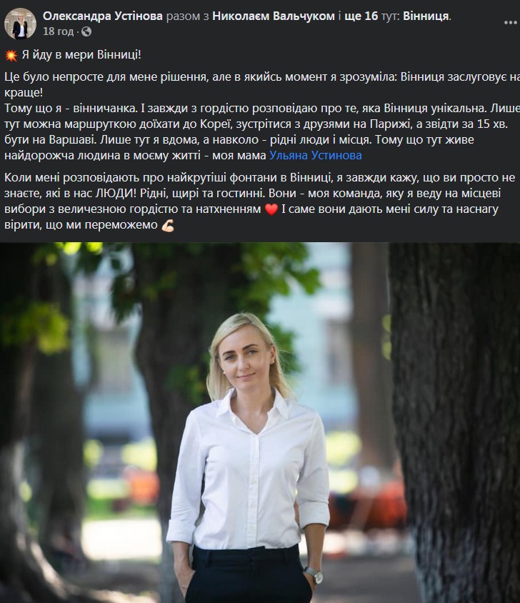 "Я йду в мери Вінниці! Це було непросте для мене рішення, але в якийсь момент я зрозуміла: Вінниця заслуговує на краще!" - написала нардеп.