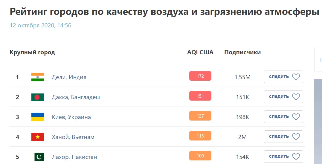 Перше місце посідає місто Делі (Індія) з індексом 172. А на другому місці опинилося місто Дакка (Бангладеш) з індексом 151. На третьому місці - Київ (Україна) з індексом 127.