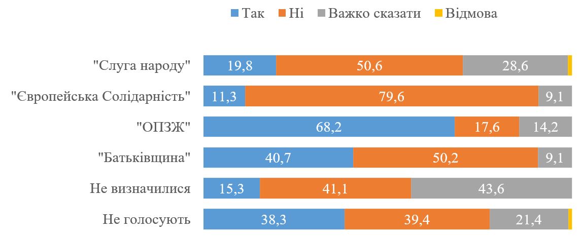 Серед виборців партії "Слуга народу" таку ініціативу підтримують 19,8% опитаних, 50,6% не підтримують, серед виборців партії "Європейська солідарність" - 11,3% та 79,6% відповідно. Серед виборців партії "Опозиційна платформа - За життя" 68,2% підтримують, 17,6% не підтримують, серед виборців партії "Батьківщина" - 40,7% та 50,2% відповідно.