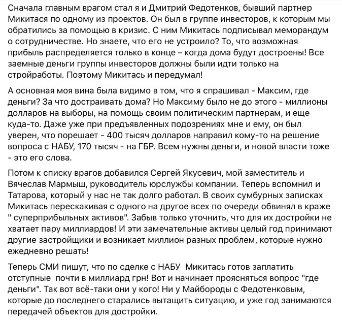 "Микитась - кінцевий бенефіціар усіх активів під ім'ям Укрбуд. Рішення приймав завжди тільки він, решта - виконували. Гроші розподілялися тільки за його вказівками, і частина з них - через людей, яких ніхто не знає. У схеми він нікого не посвячував. Вирішував питання з чиновниками і всілякими структурами тільки він. Тому всі байки про те, що він став жертвою пронозливого менеджменту - це повна маячня! Вся відповідальність за крах компанії, 13 тисяч людей, які чекають квартири і зниклі гроші - на ньому", - підсумував Майборода.