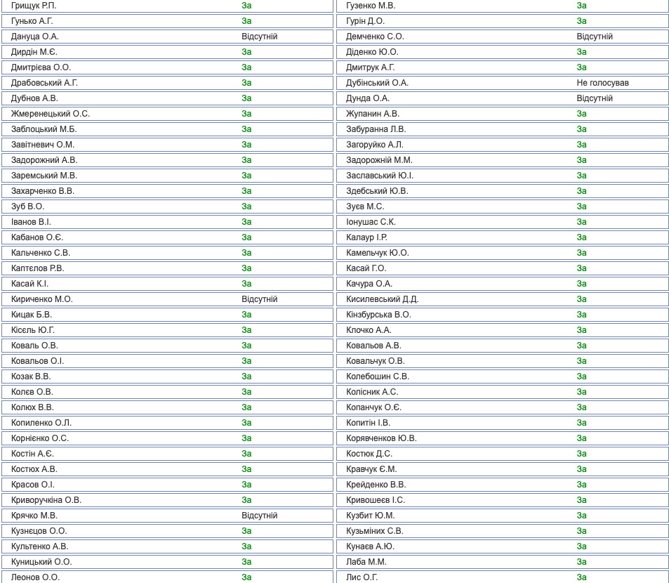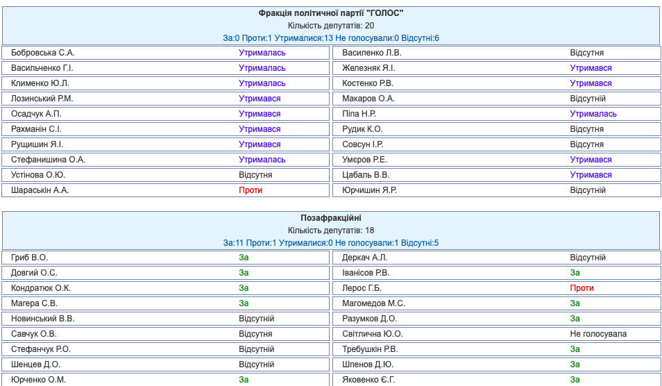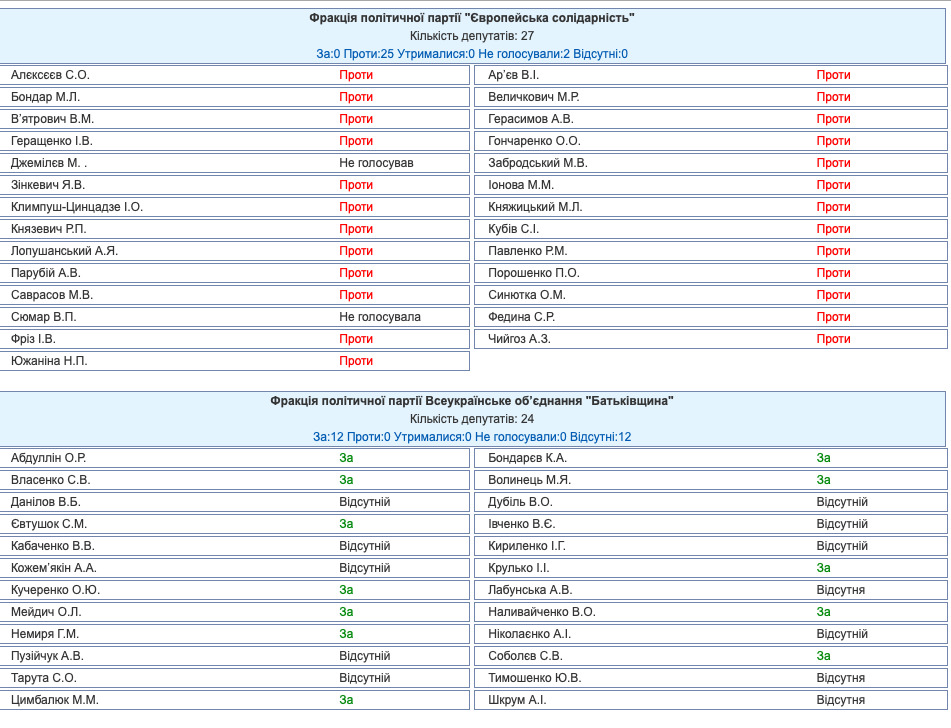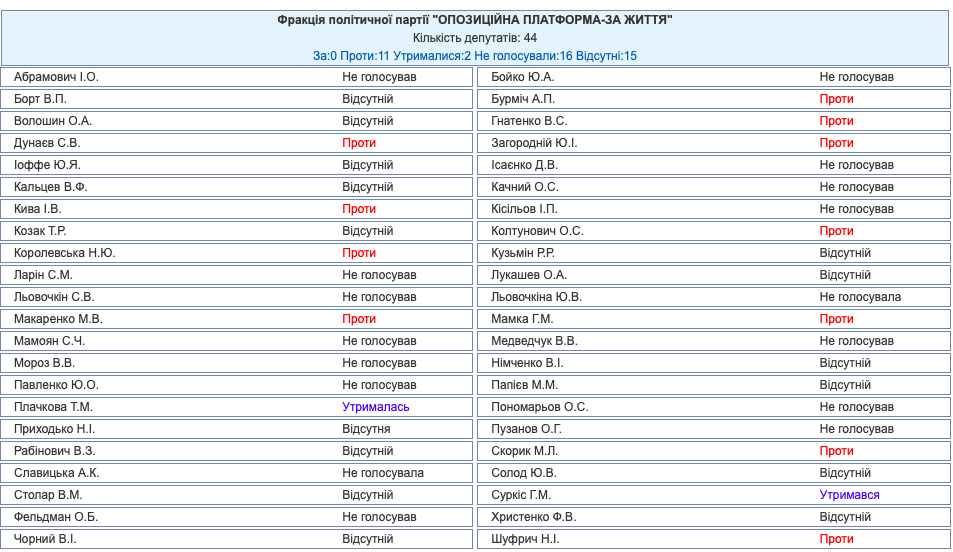 ОПЗЖ - 0 з 44 (11 голосів "проти", решта - "утрималися", були відсутні або не голосували);
