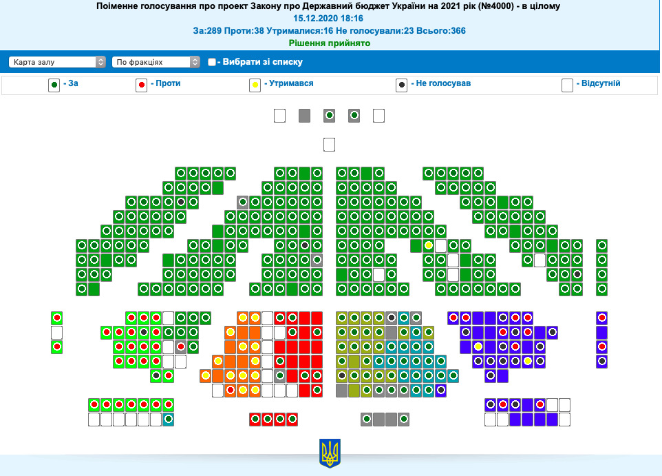 Бюджет на 2021 рік підтримали "слуги народу", "Довіра", "За майбутнє", позафракційні депутати і половина "Батьківщини".