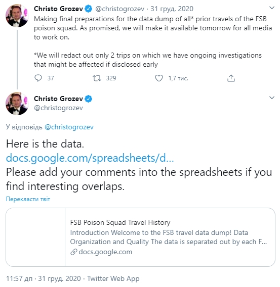 В ефірі радіо "Ехо Москви" Грозєв пообіцяв упродовж найближчих двох тижнів повідомити дані інших жертв отруєнь, до яких могли бути причетними співробітники ФСБ Росії. Він зазначив, що відсутні дані щодо двох поїздок, за якими Bellingcat зараз проводить розслідування.