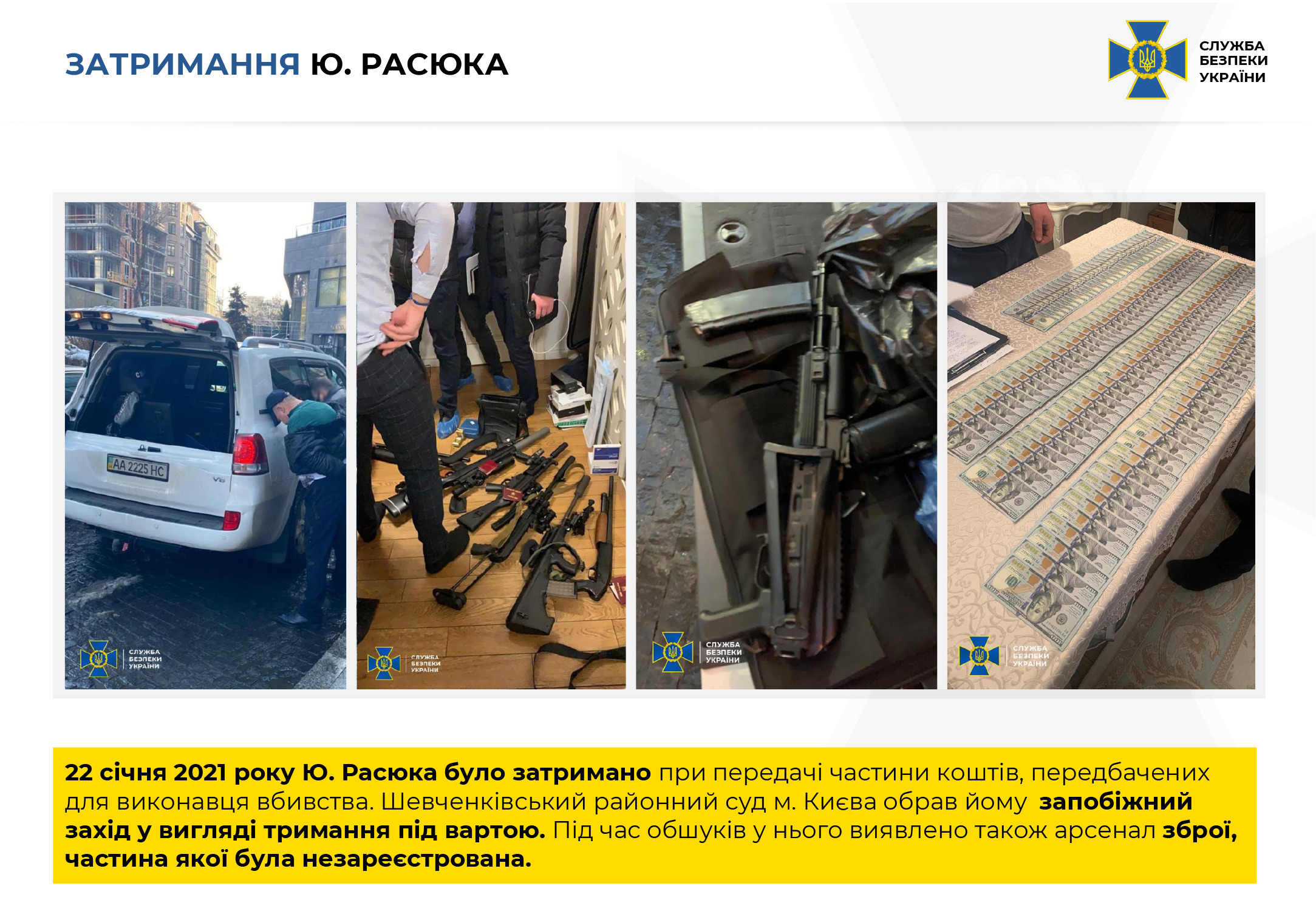 Пізніше в СБУ заявили про запобігання вбивства співробітника. Шевченківський райсуд Києва заарештував Юрія Расюка без права застави. 24 січня радник глави ОП Михайло Подоляк визнав, що вбивство генерала СБУ Андрія Наумова замовив полковник СБУ Дмитро Нескоромний.