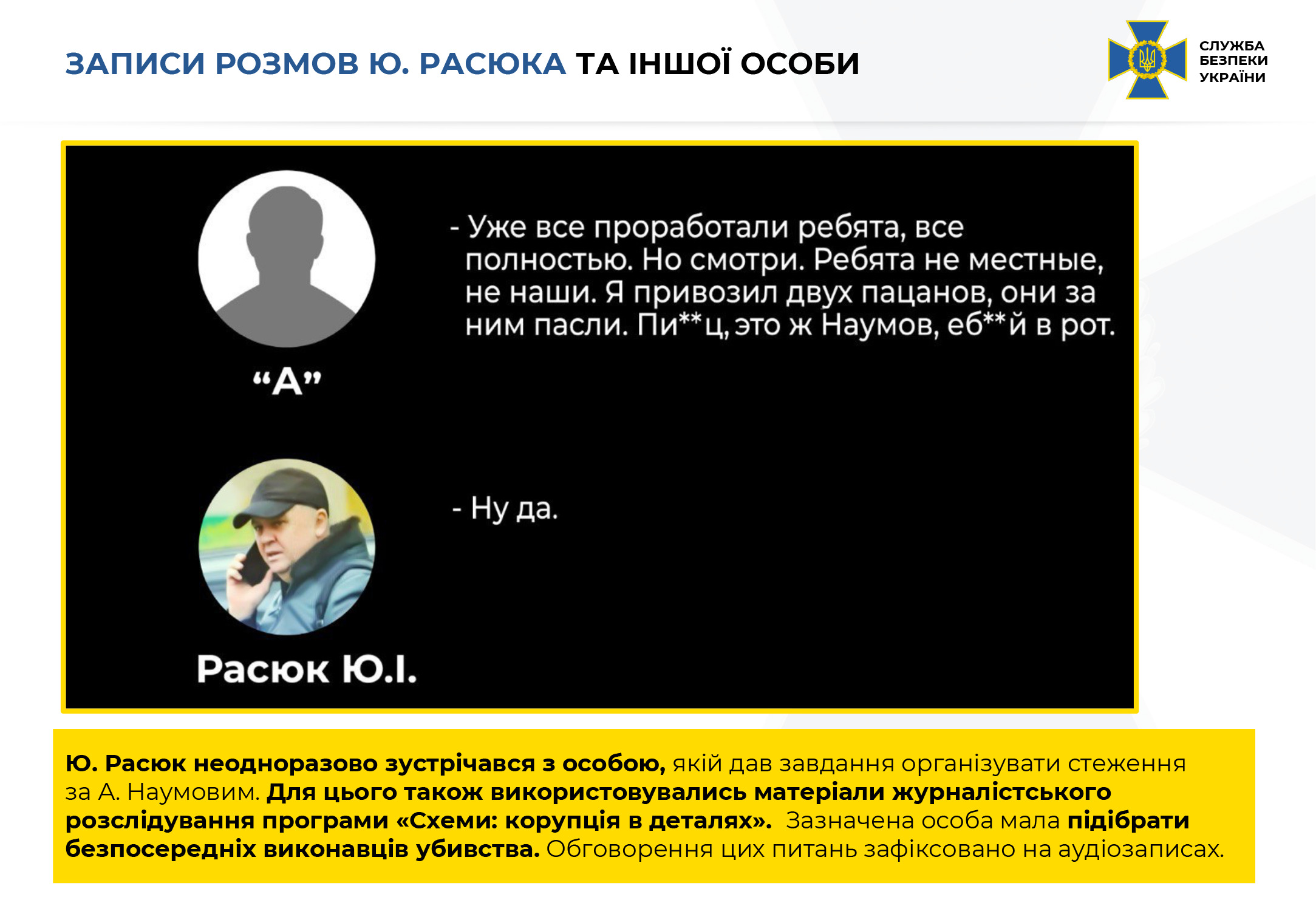 Це підтверджують фото- і відеоматеріали, та аудіозаписи розмов, на яких Нескоромний і Расюк обговорюють підготовку вбивства Наумова.