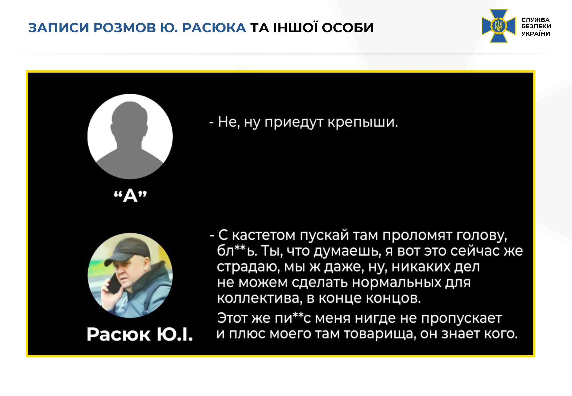 Кстати, мы тоже подумали, что Расюк в этой истории как-то странно себя ведет. А послушав «разговоры» вообще создалось впечатление, что он изначально был наумовской «торпедой», которая целенаправленно говорила под запись и о роли «Схем» и о том, что нужно Наумова «замочить». Нескоромный на записях (если это он) - вообще сторона пассивная и старается это дело отложить на «после праздников».