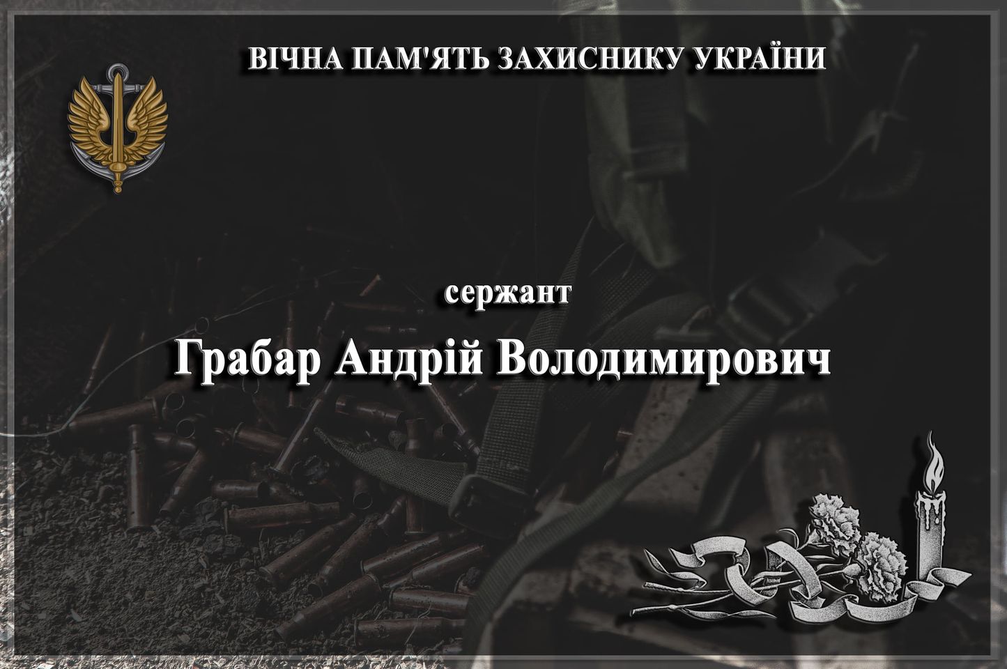 "З сумом повідомляємо, що в районі проведення операції Об’єднаних сил, захищаючи суверенітет і територіальну цілісність України, в результаті обстрілу позицій мінометів 120 калібру та гранатометів різних систем загинув наш побратим молодший сержант Грабар Андрій Володимирович. Сміливим морським піхотинцем, хорошим побратимом та патріотом своєї країни навіки залишиться Андрій Володимирович пам’яті українського народу. Весь особовий склад 36 окремої бригади морської піхоти імені контр-адмірала Михайла Білинського Військово-Морських Сил ЗС України глибоко сумує та висловлює щирі співчуття рідним і близьким Андрія. Світла пам'ять воїну! Навіки в строю... ", - зазначається в повідомленні.
