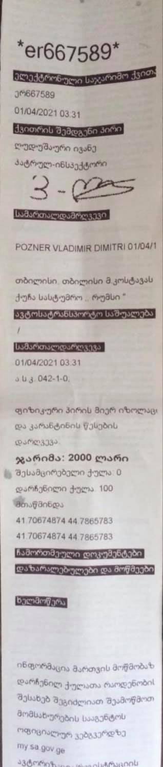 "В історії зі штрафом Володимира Познера прекрасно все. По прильоту в Москву Володимир Познер заявив що ніхто його в Тбілісі не штрафував за порушення карантинних обмежень. Але російського пропагандиста МВС Грузії швидко викрило на брехні, просто опублікувавши квитанцію про штраф, виписану на його ім'я, і оплачену на місці з кредитної картки", - йдеться в повідомленні Корчілава.