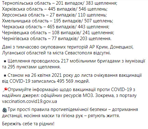 "Станом на 26 квітня 2021 року до листа очікування вакцинації проти COVID-19 записалися 495 569 осіб", - додав Степанов.