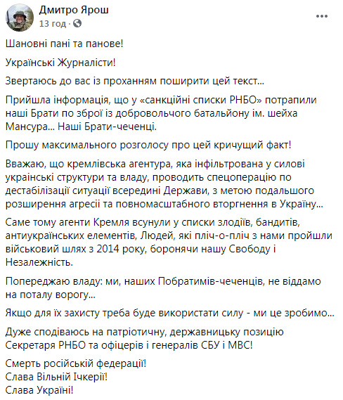 "Вважаю, що кремлівська агентура, яка інфільтрована у силові украінські структури та владу, проводить спецоперацію по дестабілізації ситуації всередині Держави, з метою подальшого розширення агресіі та повномасштабного вторгнення в Україну... Саме тому агенти Кремля всунули у списки злодіїв, бандитів, антиукраїнських елементів, Людей, які пліч-о-пліч з нами пройшли військовий шлях з 2014 року, боронячи нашу Свободу і Незалежність.Попереджаю владу: ми, наших Побратимів-чеченців, не віддамо на поталу ворогу...Якщо для їх захисту треба буде використати силу - ми це зробимо...Дуже сподіваюсь на патріотичну, державницьку позицію Секретаря РНБО та офіцерів і генералів СБУ і МВС!" - додав Ярош.
