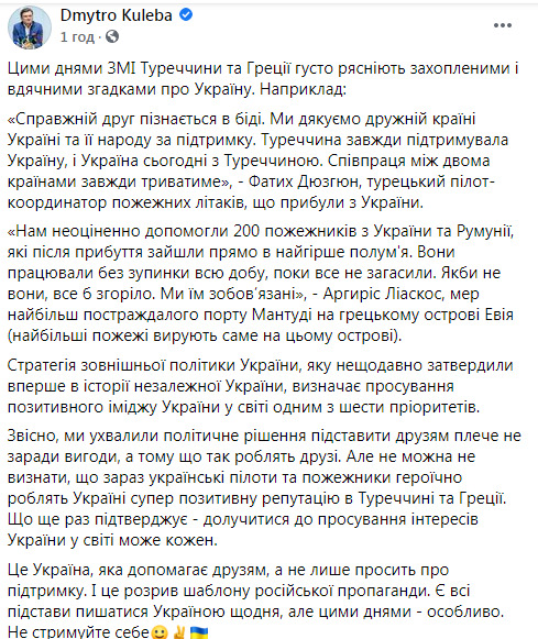 "Звісно, ми ухвалили політичне рішення підставити друзям плече не заради вигоди, а тому що так роблять друзі. Але не можна не визнати, що зараз українські пілоти та пожежники героїчно роблять Україні супер позитивну репутацію в Туреччині та Греції", - написав Кулеба.