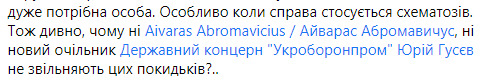 2) Заступник директора з безпеки Владислав Гадіон - "колишній" співробітник СБУ, який за Порошенка був заступником з безпеки всього концерну і прославився тотальною корупцією та безмежною жадібністю, але якщо Романова, Букіна та інших корупціонерів вигнали, то Гадіона чомусь залишили - напевно дуже потрібна особа. Особливо коли справа стосується схематозів. Тож дивно, чому ні Айварас Абромавичус, ні новий очільник Державного концерну "Укроборонпром" Юрій Гусєв не звільняють цих покидьків?", - додав Шевченко.