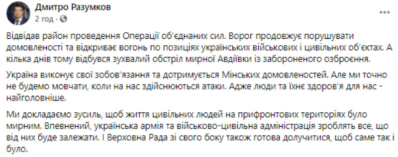 Ми докладаємо зусиль, щоб життя цивільних людей на прифронтових територіях було мирним. Впевнений, українська армія та військово-цивільна адміністрація зроблять все, що від них буде залежати. І Верховна Рада зі свого боку також готова долучитися, щоб саме так і було", - написав Разумков.