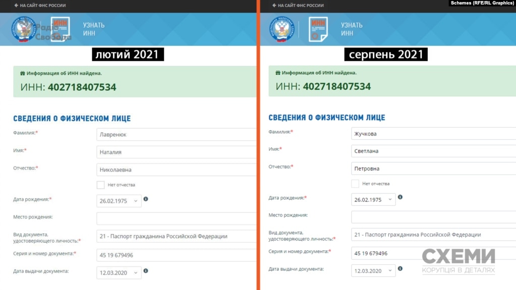 Інформацію про зміну імені журналісти знайшли на офіційному сайті Федеральної податкової служби РФ. Там зазначено, що паспорт та ідентифікаційний номер, що належали цивільній дружині нардепа "ОПЗЖ" Тараса Козака Наталії Лавренюк, тепер належать жінці на ім'я Світлана Жучкова.