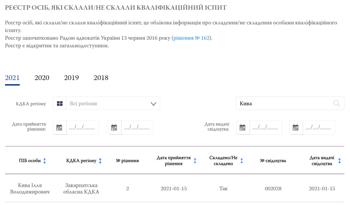 Запис у реєстрі свідчить про те, що Кива Ілля Володимирович здавав іспит у Закарпатській обласній КДКА (кваліфікаційно-дисциплінарна комісія адвокатури). З огляду на те, що людина з таким ПІБ в Україні одна, сумнівів у тому, що йдеться саме про народного депутата, немає.