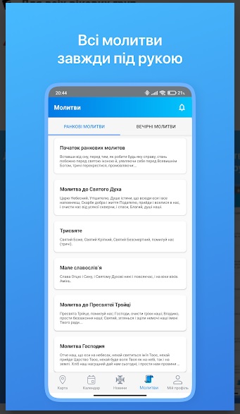Православна церква України запустила власний мобільний застосунок "Моя церква", в якому можна знайти найближчий храм і перелік молитов, а також почитати церковні новини.