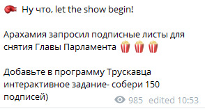 "Ну що, let the show begin! Арахамія запросив підписні листи для зняття Глави Парламенту. Додайте в програму Трускавця інтерактивне завдання - збери 150 підписів", - заявив Железняк і оприлюднив відповідний лист Арахамії.