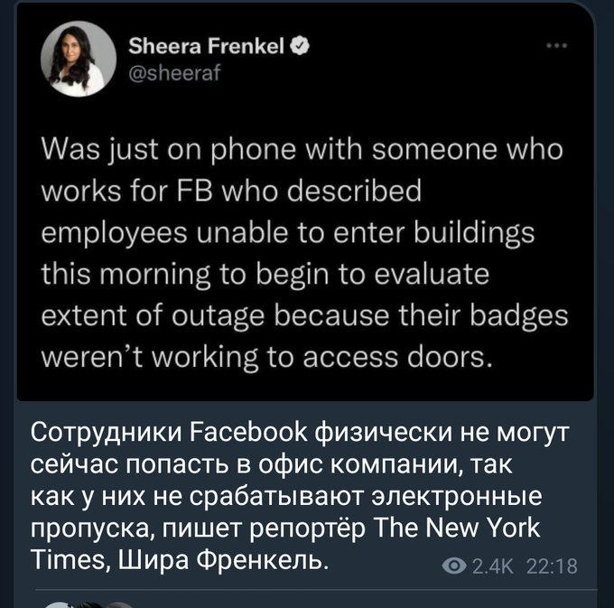 Как результат - весь FaceBook, WhatsApp, Instagram, Oculus легли во всём мире. Естественно возникла необычайная нагрузка на другие сети - Telegram, кажется прогнулся под нагрузкой. Пока что Twitter стоит стойко.