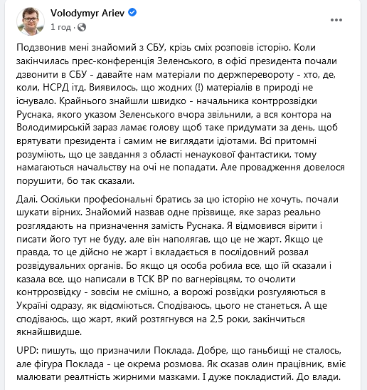29 листопада Зеленський звільнив начальника департаменту контррозвідки СБУ генерал-майора Олександра Руснака.