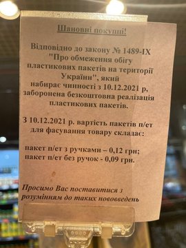З 10 грудня вводиться в дію Закон № 1489-IX "Про обмеження обігу пластикових пакетів на території України". А саме починає діяти перший етап обмежень.