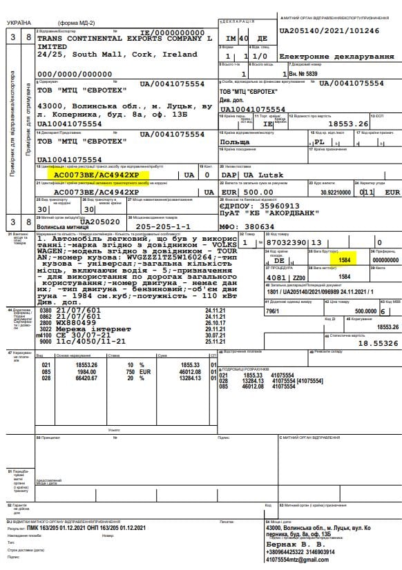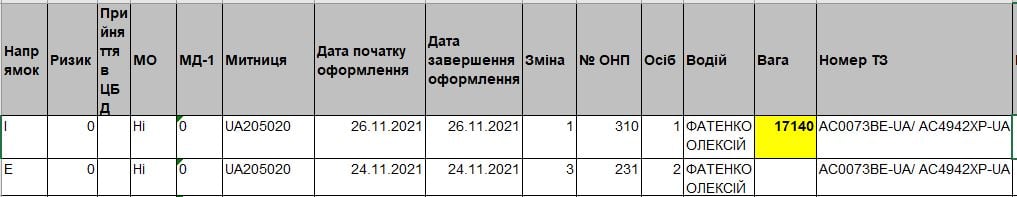 "Наприклад, автомобіль AC0073BE-UA/AC4942XP-UA, який проходить у матеріалах справи Львівського ДБР та який заїхав на "Ягодин" 26 листопада. За декларацією вага вантажу становить 1584 кг. А ось за даними вагового комплексу вага вантажу склала 17 140 кг. Але перевищення ваги в 11 разів та її явна невідповідність документам не викликало у зміни Кирилича бажання фуру доглянути. І таких машин лише за останній місяць було 14", - пише Плинський.