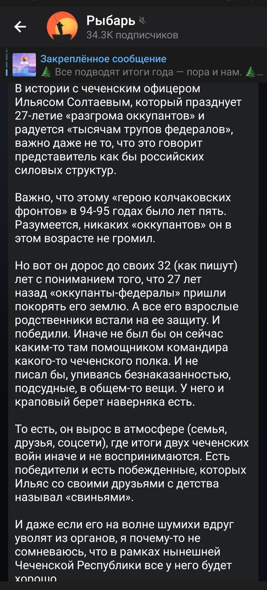 Помічник командира чеченського полку спецпризначення імені Ахмата Кадирова, капітан Ільяс Солтаєв назвав російських військових окупантами, коментуючи в інстаграмі річницю штурму Грозного в ніч проти 1 січня 1995 року.