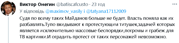 Одного разу на Майдані коло ЦУМу вночі десь коло2-ї ночі патруль при мені затримав одного доходягу в міліцейській формі з старлейськими погонами. Я як офіцер запасу відразу оприділив, що доходяга ніякого відношення до служби немає. Хтось навіть хотів його вдарити, але я та інші стримали і пояснили, що ті скоти відправили пацана на Майдан в формі мента не його зросту на убой, щоб майданівці йогопокалічили і звинувати нас в бандитизмі. Але люди на Майдані були найкращі - там швалі, особливо вночі, практично не було.