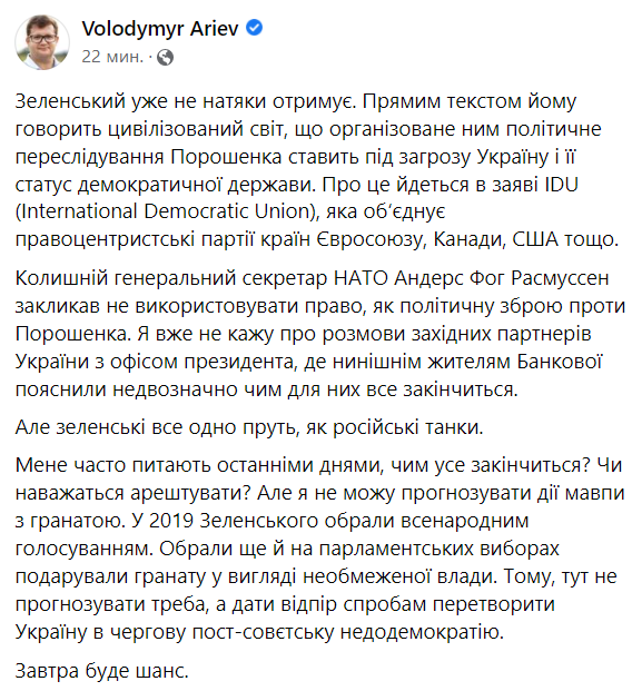 Хочу подякувати Володимиру Зеленському за те, що він дав привід тисячам людям надіслати мені смс та через соціальні мережі слова підтримки, зробити заяви навіть від тих, від кого я не очікував підтримки. І вони підтримували не тільки і не стільки Порошенка, вони підтримували демократію в Україні. Вони підтримували європейський вибір. Вони підтримували те, щоби Україна не повернулася назад, не була відкинута в Малоросію часів Януковича, в руйнацію демократії, в політичну розправу над лідером опозиції. І ці тисячі повідомлень для мене є твердою гарантією, що нічого в них не вийде.